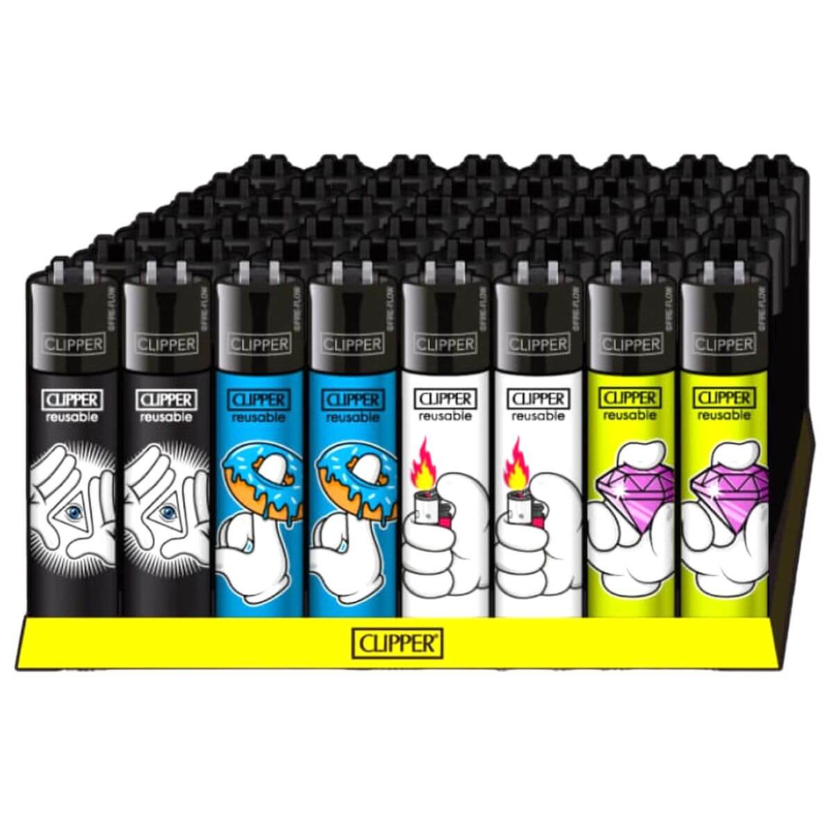El expositor de 48 unidades de Clipper Classic Cartoon Hands #3 añade un toque llamativo y animado a la línea de encendedores recargables de Clipper. Con expresivos diseños de manos de estilo caricaturesco, cada encendedor combina imágenes divertidas con el fiable sistema recargable y el pedernal reemplazable de Clipper, lo que garantiza un rendimiento y una sostenibilidad a largo plazo. Perfecto para tabaqueros, minoristas de estilo de vida y distribuidores que buscan diseños divertidos y coleccionables con una funcionalidad fiable.
